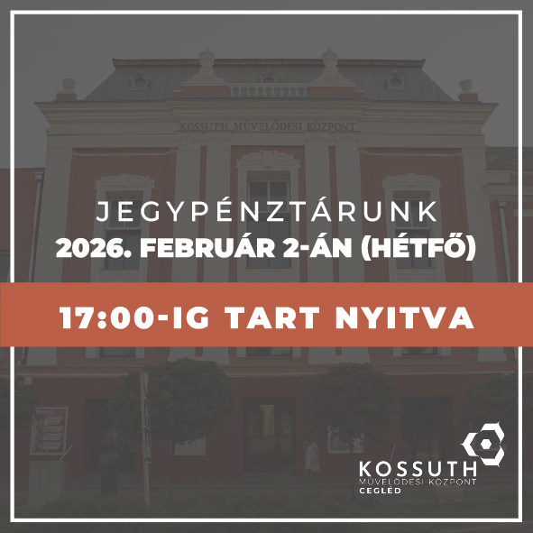 Jegypénztári információ Tájékoztatjuk kedves látogatóinkat, hogy 2026. február 2-án (hétfőn) jegypénztárunk 17:00-ig tart nyitva. Köszönjük megértéseteket! Kossuth Művelődési Központ – Cegléd
