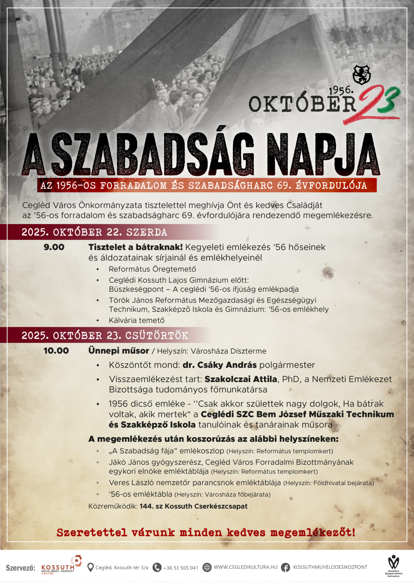 Cegléd Város Önkormányzata tisztelettel meghívja Önt és kedves Családját az ’56-os forradalom és szabadságharc 69. évfordulójára rendezendő megemlékezésre.