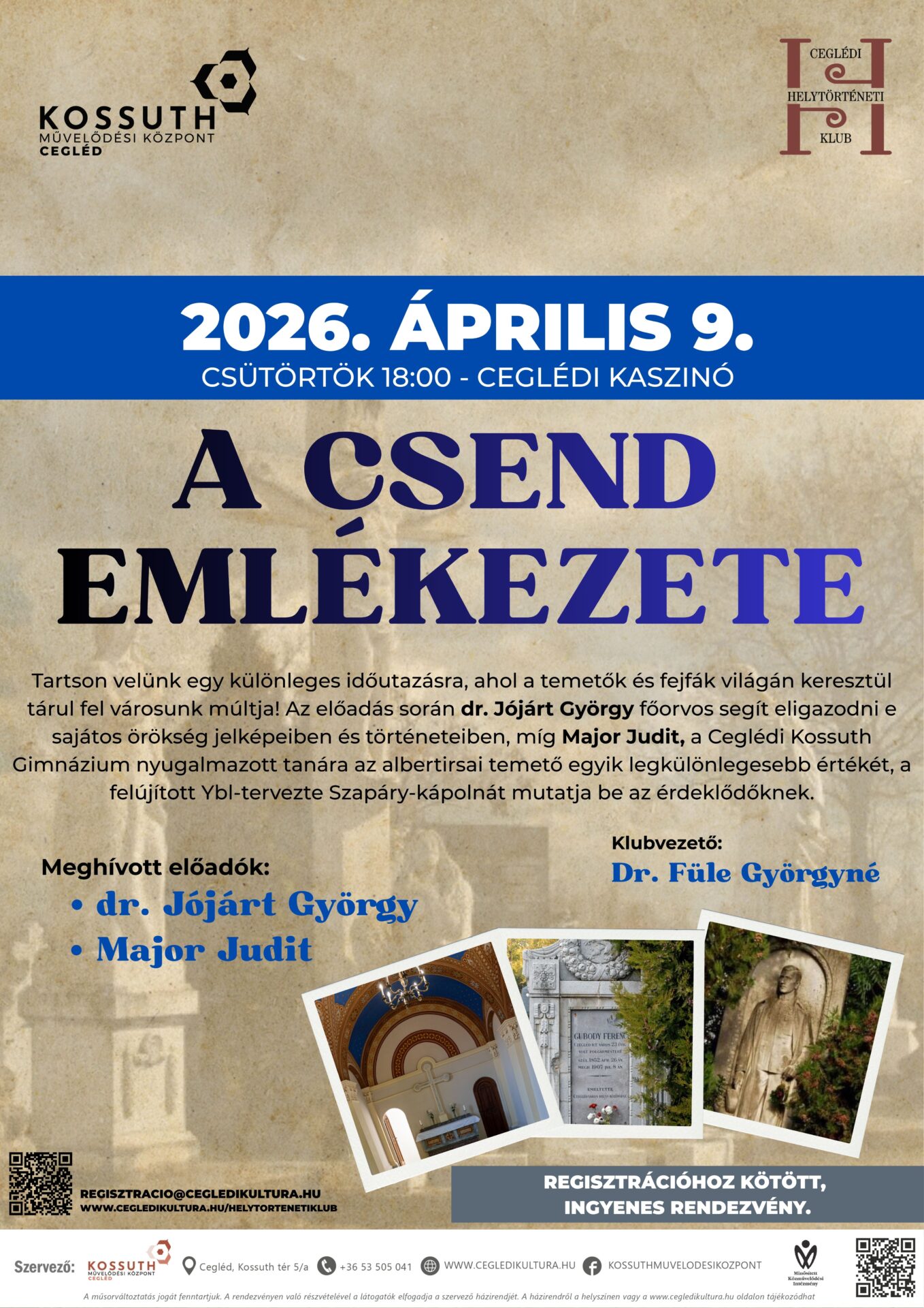 Tartson velünk egy különleges időutazásra, ahol a temetők és fejfák világán keresztül tárul fel városunk múltja! Az előadás során dr. Jójárt György főorvos segít eligazodni e sajátos örökség jelképeiben és történeteiben, míg Major Judit, a Ceglédi Kossuth Gimnázium nyugalmazott tanára az albertirsai temető egyik legkülönlegesebb értékét, a felújított Ybl-tervezte Szapáry-kápolnát mutatja be az érdeklődőknek.