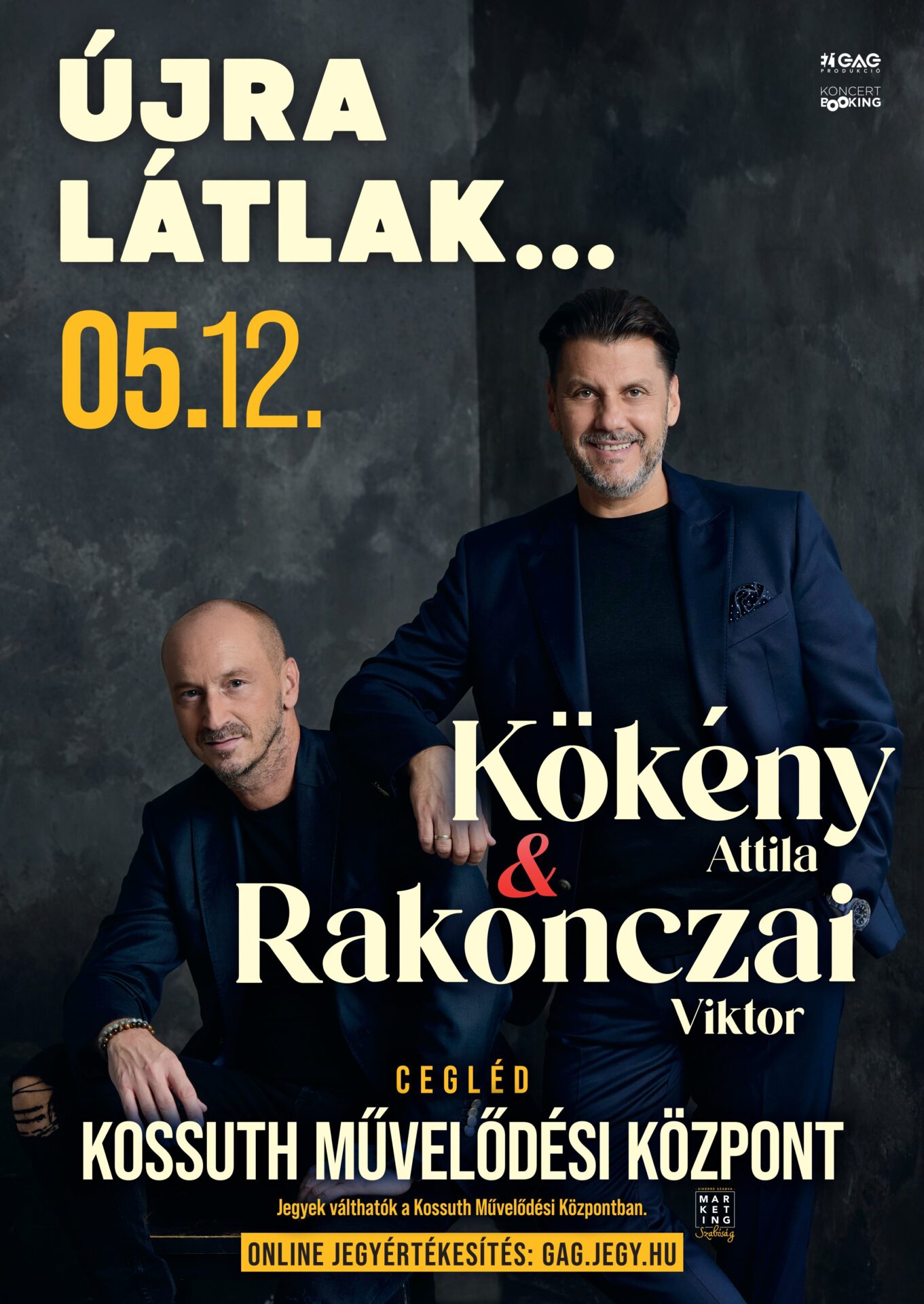 A teltházas MVM Dome-ban bemutatott jubileumi „Kökény 50” koncert mérföldkő volt Kökény Attila és Rakonczai Viktor közös pályáján. Az országos koncertsorozat elsöprő sikere után most egy új fejezet kezdődik. Az „Újra látlak…” turné nemcsak egy új koncertsorozat, hanem egy személyes meghívás is: visszatérés a közönséghez, a dalokhoz és azokhoz a pillanatokhoz, amelyek az elmúlt években közös élménnyé váltak. Kökény Attila, Szenes Iván-díjas előadóművész és Rakonczai Viktor, ARTISJUS- és EMeRTon-díjas zeneszerző, zenei producer több mint egy évtizede alkotnak meghatározó párost a magyar zenei életben. Közös munkájuk során számos ismert és szeretett dal született, koncertjeik pedig az őszinte érzelmekről, a zenei igényességről és a közönséggel való különleges kapcsolatról szólnak. A turné második állomása május 12-én, egy különösen meghitt alkalomhoz kapcsolódik: Anyák napjához. Ez az este méltó ünnepe lehet a szeretetnek, a figyelemnek és azoknak, akik mindig mellettünk állnak. Az „Újra látlak…” koncert válogatás mindabból, ami Kökény Attila és Rakonczai Viktor közös zenei világát meghatározza: ismert dalok, új zenei pillanatok és az a bensőséges hangulat, amely minden alkalommal megismételhetetlenné teszi az estét.